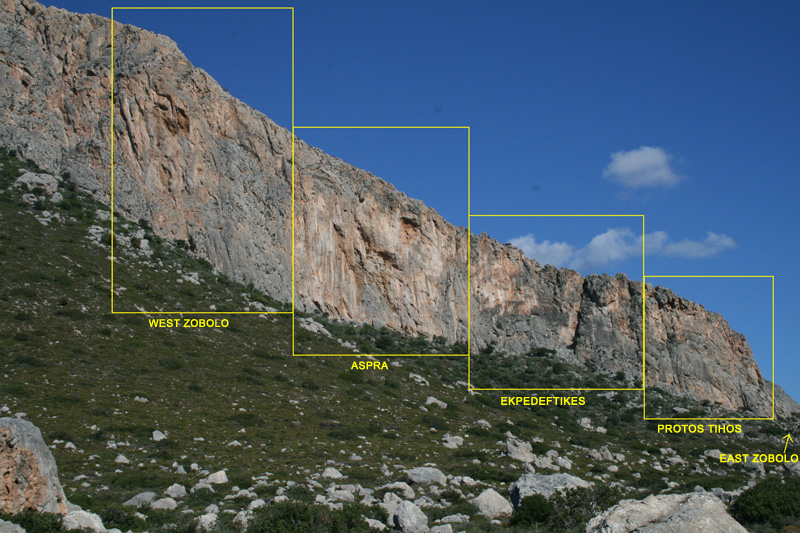 58 routes including some multipitch climbs. Approach from the parking: 8 min to sector Protos Toixos,10 min to PLAKES, 12 min to EKPAIDEFTIKES, 14 min to ASPRA and 17 min to WEST ZOBOLO. Sun after 11:00 except from West Zobolo that sun arrives at 12:00.Please click on the map areas on the left to view the corresponding topos.